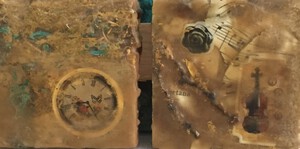Painting with beeswax combined with oil colors, ink, photocopies. Mixed Media with melted beeswax in the lead.